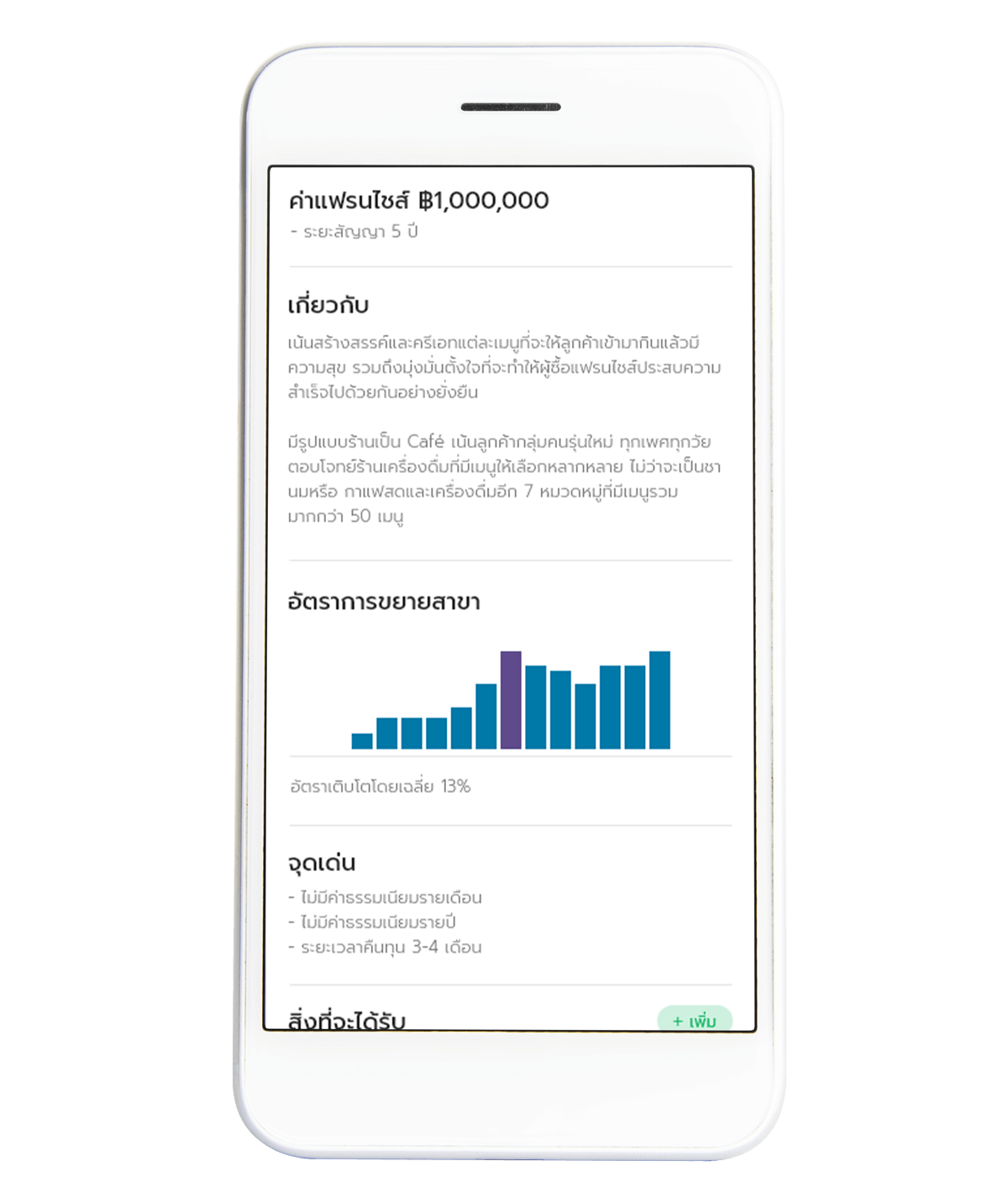 ให้คุณเผยแพร่ข้อมูลแฟรนไชส์เพื่อมองหานักลงทุน หรือมองหาพื้นที่เช่าน่าสนใจ เพื่อขยายสาขาของแฟรนไชส์คุณ พร้อมแสดงสาขาบนแผนที่ และอัตราการเติบโตของสาขาภายใต้ผู้ซื้อแฟรนไชส์ในระบบ